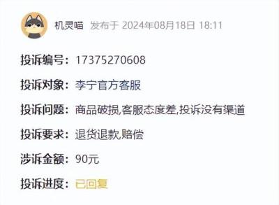 8月18日,平台過審投訴編號17375270608顯示,一消費者稱,自己在李寧线下店購买衣服,有質量問題,店員態度惡劣且拒絕退貨,自己與李寧官方客服聯系後,經過多次溝通才答應退貨要求,對於消費者的投訴不做處理。