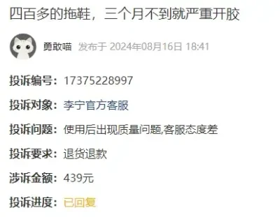 瀏覽黑貓投訴,截至2024年8月22日,李寧品牌相關投訴累計4906條。主要涉及產品質量、產品服務、產品價格等方面。