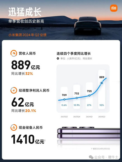 2024年第二季度,小米集團實現營收利潤雙增長,總營收達889億元,同比增長32%;經調整淨利潤達62億元,同比增長20.1%。