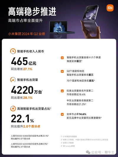 2024年第二季度,小米智能手機收入同比增長27.1%,達到465億元。據Canalys數據,二季度,小米全球智能手機出貨量達4220萬台,同比增長28.1%,排名穩居第三,市場份額爲14.6%。