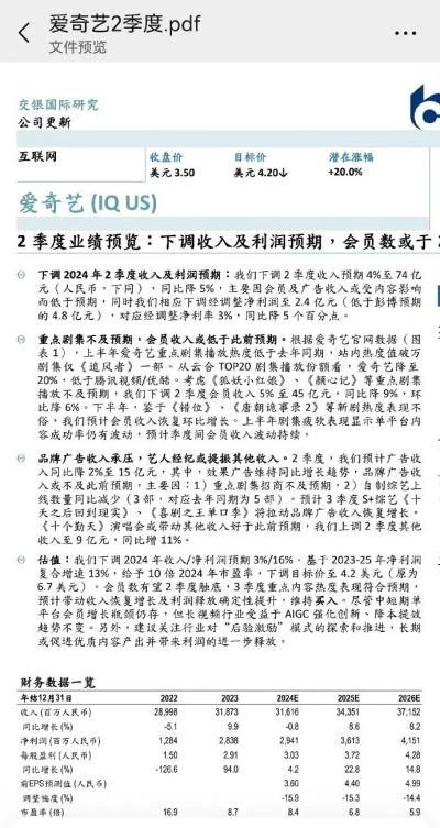8月22日晚間,愛奇藝發布2024年Q2業績,其收入爲74億元,同比下降5%;淨利潤約爲6869萬元,對比2023年同期歸屬於愛奇藝的淨利潤爲3.65億元,同比下降約81.2%。在非美國通用會計准則下,經調整淨利潤約2.47億元,同比減少58%,從第一季度开始,愛奇藝不再披露會員數量。截至當地時間8月22日美股收盤,愛奇藝股價下跌15.58%,觸及52周新低。