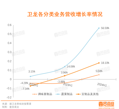 在2022年、2023年同期,衛龍的調味面制品營收規模同比一直呈負增長,雖然2024H1,該項業務營收增長率實現近三年首次同比爲正,但5.04%的增速和蔬菜制品、豆制品的增速對比來看並不算多。