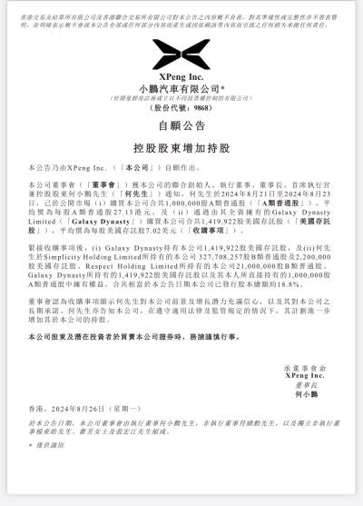 8月26日,蓋世汽車注意到,小鵬汽車發布公告稱,該公司首席執行官兼控股股東何小鵬於2024年8月21日至2024年8月23日,已於公开市場購买本公司合共100萬股A類普通股,平均價爲每股A類普通股27.13港元,及通過由其全資擁有的Galaxy Dynasty Limited購买本公司合共約142萬股美國存托股,平均價爲每股美國存托股7.02美元。