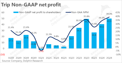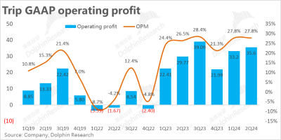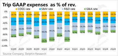 攜程本季度的財報,嚴格的角度來看不算非常強勁的表現,收入僅是符合預期,在走高的基數下增速明顯的下滑。GAAP口徑下經營利潤僅是稍高於預期,環比增長幅度不大,利潤率也是環比持平的,並不算很超預期。