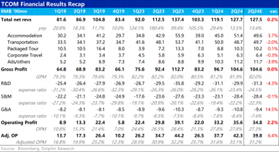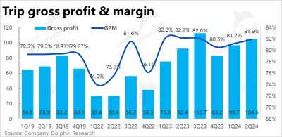盈利層面,本季攜程的毛利率繼續環比小幅走高0.7pct到81.9%,雖然較23年時的高點還有一點距離,但近三個季度在持續走高。海豚投研認爲毛利率的環比走高這應當是利潤更高的出境業務比重上升的貢獻。毛利潤絕對額上近105億,和市場預期完全一致,同比增長13%和營收增速基本一致。
