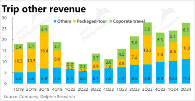 而此次薄弱的環節——幾乎零增長的機票業務——背後的原因之一是攜程減少保險等捆綁X產品的銷售力度。這個選擇,在海豚君看來,部分是公司在業務整體打开局面的情況下,主動選擇去更好地平衡平台機票變現與用戶體驗之間的矛盾,不算是非常嚴重的壞消息。