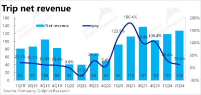 整體業績上,本季攜程實現淨收入128億元(剔除營業稅),同比增長13.6%,大體符合預期。在越發走高的基數下,相比上季近30%的增長,本季營收增速的明顯下滑,仍是驗證了國內整體酒旅需求的趨於常態。