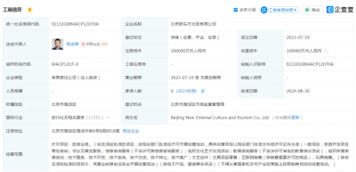 作爲文旅市場的新生力量,新東方文旅成立於2023年7月,注冊資本10億元。公司經營範圍包括旅遊業務、旅遊开發項目策劃咨詢、組織文化藝術交流活動等。