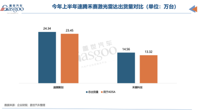 反映到終端市場,就是激光雷達制造商的出貨量大幅提升。財報數據顯示,今年上半年,速騰聚創激光雷達總出貨量爲24.34萬台,相比去年同期勁漲416%;其中用於ADAS(高級駕駛輔助系統)的激光雷達出貨量爲23.45萬台,同比大增488%,幾乎翻了五番。從業務佔比看,用於ADAS的激光雷達佔比超96%,是公司銷售主力產品。
