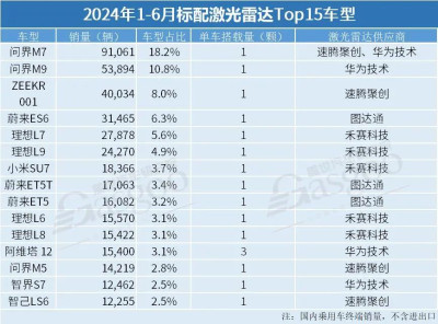 另外,根據蓋世汽車研究院數據統計,今年上半年標配激光雷達Top15銷量車型中,搭載禾賽科技的有5款,搭載速騰聚創的車型有4款;但就總出貨量排名看,蓋世汽車研究院數據顯示,速騰聚創以40.3%的市場份額排名第一,華爲以24.6%的份額排名第二,禾賽科技以19.9%的佔比排名第三。