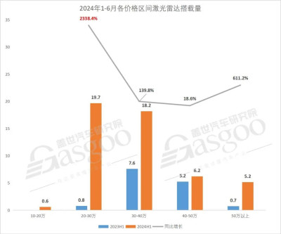 對於速騰聚創和禾賽科技來說,二者產品成本均出現明顯下探,這源於車市產品的價格內卷和智駕向20萬元左右市場普及和滲透。蓋世汽車研究院數據顯示,今年上半年,20-30萬元成爲激光雷達上車的主要價格區間,搭載量同比激增2338.4%,呈現出搭載車輛均價降低的趨勢,而在不久的將來,激光雷達的重要增量市場將出現在20萬元以下市場。