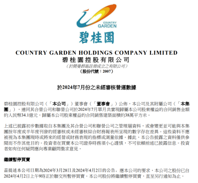 碧桂園方面回應,行業目前依然充滿挑战,受市場預期轉弱、需求疲軟的影響,公司銷售業績持續承壓。2024年前7月,公司權益銷售金額合計約328億元,同比下降約78%。在行業銷售整體承壓疊加資金調撥受限等多重因素影響下,公司尚未能就公司債應兌付的本金利息籌措到足額的兌付資金。