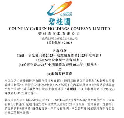 基於上述原因,碧桂園預期將會進一步延遲刊發2023年度業績。與此同時,公司2024年股東周年大會延期。