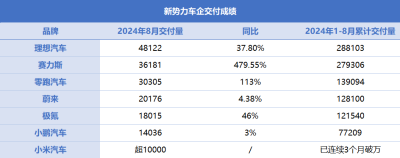 從交付量來看,小鵬汽車今年前8個月累計交付新車共77209台,月均交付量沒破萬,不管是交付總量還是同比增速都已顯著落後理想、賽力斯等品牌。