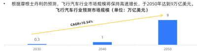 對於車企來說,這意味着一個方興未艾的萬億級別藍海市場。根據摩根士丹利的預測,飛行汽車行業市場規模將保持高速增長,於2050年達到9萬億美元。目前,全球範圍內已有超過200家企業或機構在研發飛行汽車產品。