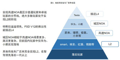 行業競爭格局特斯拉技術領先,大多車廠處於L2+階段。