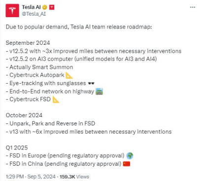 TeslaAI在社交媒體平台“X”上發帖稱,特斯拉計劃明年第一季度在中國和歐洲推出被其稱爲“全自動駕駛”(FSD)的高級駕駛輔助系統,目前正在等待監管部門的批准。