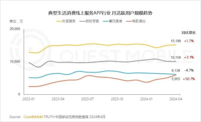 QuestMobile數據顯示,2024年一季度城鎮居民人均消費支出達到8943元,且持續增長。其中,外賣服務、即時零售、餐飲美食、電影演出APP整體月活用戶規模分別達到1.52億、1.02億、0.61億、0.6億,同時,月人均使用次數也持續增長,分別達到70.1次、21次、24.5次、25.6次。