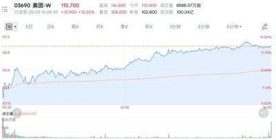 受財報鼓舞,8月29日,在恆生科技指數大幅低开的情形下,美團依然逆勢高开7%,且一路走高,收至12.55%,凸顯了市場對美團的偏愛。