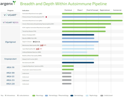 除此以外,Argenx希望將艾加莫德的商業化或臨牀开發工作拓展到15項適應症,包括甲狀腺眼病(TED)、大皰性類天皰瘡(BP)、原發性幹燥綜合徵(pSS)、新冠肺炎後體位性心動過速綜合徵(PC-POTS)、膜性腎病(MN)、狼瘡性腎炎(LN)、尋常型天皰瘡和落葉型天皰瘡(PV和PF)、特發性炎症性肌病、ANCA相關性血管炎(AAV)、抗體介導的排斥反應(AMR)等。
