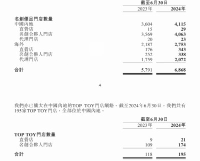 名創優品一直有一個萬店目標,而在2024上半年,包括名創優品、潮玩品牌TOP TOY在內的集團全球門店已經突破7000家。在中國內地的4115家門店中,只有29家爲直營店。