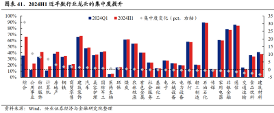最後,從上市公司龍頭的營收集中度來看,2024上半年也有一定提升。Wind數據顯示,31個一級行業中共有15個行業的龍頭營收集中度較2024Q1提升,佔比達48.39%;所有行業龍頭集中度的中位數從2024Q1的35.35%進一步提升至2024上半年的36.97%。