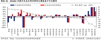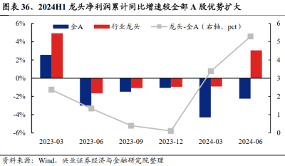 興業證券做了一項統計,將31個申萬一級行業內,市值排名前五的個股定義爲龍頭公司。根據wind數據顯示,2024上半年,龍頭整體淨利潤增速爲3.05%,增速高於全部A股5.29個百分點,領先幅度較2024Q1的3.38個百分點明顯擴大。