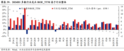從分行業的情況來看,多數行業的龍頭淨利潤同比增速和ROE水平高於行業整體。2024上半年,31個一級行業中共有21個行業龍頭淨利潤增速高於行業整體,除社會服務外的所有行業龍頭ROE_TTM均高於行業整體水平。
