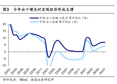 從出口看,今年1-7月人民幣計價下我國出口累計同比增速達到6.7%,明顯高於2023全年的0.6%,說明外需對宏觀經濟的支撐還是比較強的;