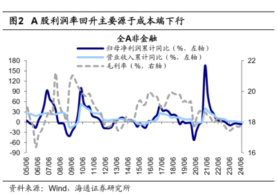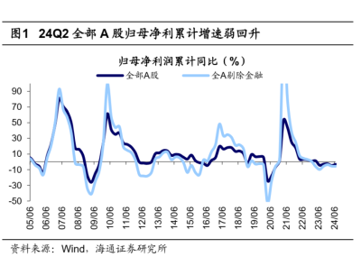 首先,從營收累計同比增速看,Wind數據顯示,2024Q2全部A股爲-0.6%,較一季度的0.2%而言,同比增速有所下降。