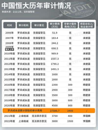貓崽統計了一下,那些年,恆大付給普華永道的審計及非審計費用,累計達到3億。