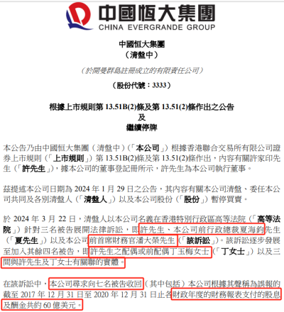 此前,恆大發布公告,追討許家印、前CEO夏海鈞、前CFO潘大榮、前妻丁玉梅及三間關聯實體,2017-2020年間的股息及酬金。
