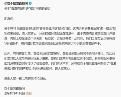 交個朋友首席推薦官羅永浩補充稱,其旗下的部分垂類直播間或曾售賣美誠月餅,現在處於排查資料階段,確認後也將按照“退一賠三”進行賠付。相比之下,三只羊的沉默爲其“售前有服務,售後有保障”的標語添上了幾分黑色幽默的意味。
