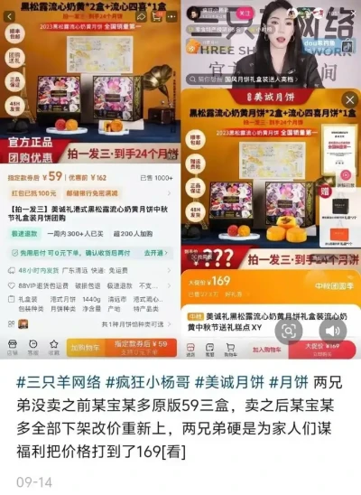 此前,三只羊旗下帶貨主播“瘋狂小楊哥”(張慶楊)及其它直播間在售的一款名爲“香港美誠”的月餅引發爭議。不少網友質疑該品牌產地、售價的真實性,直指三只羊和小楊哥涉嫌虛假宣傳、欺騙消費者。