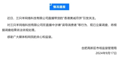 9月17日,合肥高新區市場監督管理局發布通報稱,對三只羊網絡科技有限公司(下稱“三只羊網絡”或“三只羊”)在直播中涉嫌“誤導消費者”等行爲,現已立案調查,將根據調查結果依法依規處理。