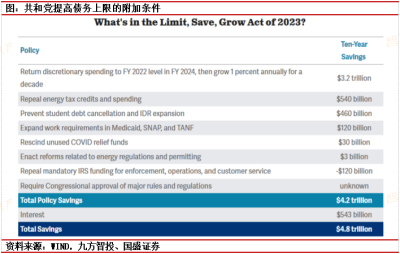 事件:美國政府債務規模已於1月19日觸及法定上限,至今兩黨仍未達成一致方案,美國財政部資金最早將於6月1日耗盡,屆時美國國債將面臨違約風險。