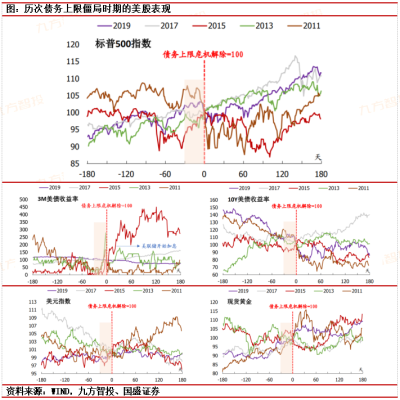 歷史經驗顯示,當債務上限剛觸及時,對市場的影響往往不明顯;而在最後時刻到來的前1個月影響最顯著,表現爲全球全球風險偏好回落,避險需求導致美元上漲,短期美債收益率大幅飆升。這反映出債務上限僵局將打壓市場風險偏好,並引發對即將到期的美國國債發生違約的擔憂,但這一影響效果偏短期;當債務上限危機解除之後,市場風險偏好會迎來修復,各類資產價格走勢往往出現反轉。