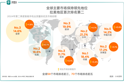 其中,小米在拉美和東南亞的出貨量排名均升至前二,在中東和非洲排名分別位居第二及第三名,市場份額均實現較大幅度增長。