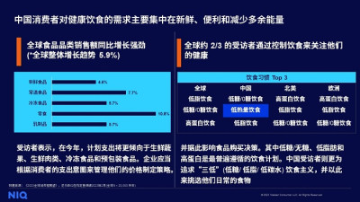 在健康方面,尼爾森IQ的全球調研發現,全球消費者未來在生鮮採購上計劃支出更多,例如新鮮蔬菜/水果、生鮮肉類、冷凍食品,預包裝食品或預制菜等。同時全球約2/3的受訪者表示會通過控制飲食來關注健康,從全球宏觀地域角度來看亦會略有差異,比如中國消費者仍然將低糖/0糖、低熱量、低脂等三低飲食列爲最關注的飲食習慣,而北美和歐洲地區的消費者將高蛋白飲食列爲首位,但同時關注低脂訴求。