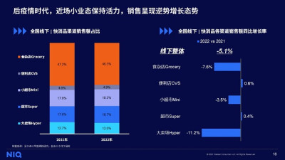 從线下渠道看,後疫情時代,近場小業態保持活力,銷售呈現逆勢增長態勢。尼爾森IQ將线下渠道分爲大賣場、超市、小超市、便利店和食雜店這五大類。我們明顯可以看到在疫情期間有增長的渠道主要集中在便利店和超市這兩個渠道,尼爾森IQ數據顯示,便利店在2022年的銷售額同比增長0.6%,超市增長0.4%。