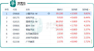 其中,小鵬汽車-W(09868.HK)漲勢最爲強勁,截至發稿前,漲幅擴大至9.83%;吉利汽車(00175.HK)也上漲了6.44%,理想汽車-W(02015.HK)、蔚來-SW(09866.HK)、零跑汽車(09863.HK)都有不錯的表現,漲幅分別爲4.57%、4.26%、3.37%。