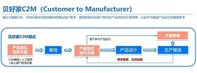 公开資料顯示,貝好家的定位不是傳統房地產开發,而是數據驅動型住宅开發服務平台,主要爲業主方、开發商等合作夥伴提供“1+2”模式的綜合解決方案。“1”代表的產品解決方案是核心,具體爲以C2M(Customer to Manufacturer,從消費者到制造者)爲理念,通過大數據分析,利用AI算法深度洞察和挖掘出客戶需求,行成包含產品定位、產品初步設計、產化深度設計等的全套產品解決方案;“2”分別指靈活多樣的資金服務、线上线下一體化的高效營銷服務。