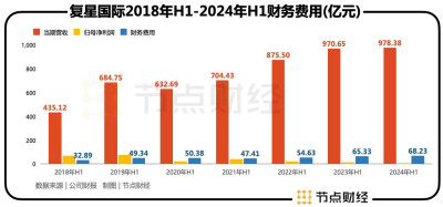 持續不斷的資產清算出售,導致的一個重要變化,就是財務費用在快速上漲。《節點財經》發現,從2022年上半年至2024年上半年,復星國際財務費用分別爲54.63億元、65.33億元和68.23億元,同期歸母淨利潤分別爲22.71億元、13.59億元和7.19億元。