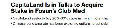 據彭博引述消息指,新加坡凱德投資(CapitaLand Investment Ltd.)正在深入商談擬以數億歐元,從復星國際收購法國豪華連鎖度假村Club Med(地中海俱樂部)約20至30%股份。