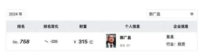 困境之下,郭廣昌的個人財富也在經歷“過山車”。2024年胡潤全球富豪榜顯示,郭廣昌的財富值爲315億,對比2020年640億的身家已縮水過半。而在復星國際上市的2007年,郭廣昌的身家爲360億元,位居大陸富豪榜第10位,也是他首次登上上海首富寶座。