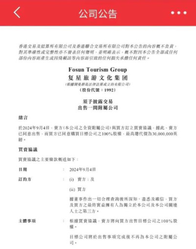 爲了這家旅行社,復星文旅前後總投資金額過億英鎊。但是,根據9月5日復星旅文發布的公告顯示,此次出售交易最高總代價爲3000萬英鎊,堪稱“骨折價”。