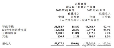 從業務方面看,第一季度,小米智能手機業務收入爲350億元,同比下降23.6%;IoT與生活消費產品收入爲168.34億元,同比減少13.6%;互聯網服務收入爲70.28億元,同比減少1.2%。
