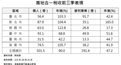 統計顯示,今年前三季個人全國房地合一稅收501.5億元,年增9成,營利事業則是一年申報一次,今年房地合一稅收291.4億元,年增47.2%,前三季個人房地合一稅收繳稅王是台中市,個人房地合一稅收93.1億元,年增68.8%,其次則是新北市87.9億元,反映台中市房價漲幅比新北市更顯著,不過營利事業的房地合一稅則是台北市最多,金額高達91.7億元。
