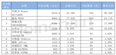根據MDCLOUD(醫械數據雲)統計的已披露的品牌與金額數據結果,2023年第一季度中,貝朗排名第一,中標總額爲8334.8萬元,中標數量爲354件。威高排名第二,中標總額和中標數量分別爲6664.2萬元和418件。費森尤斯排名第三,中標總額和中標數量分別爲6369.1萬元和310件。