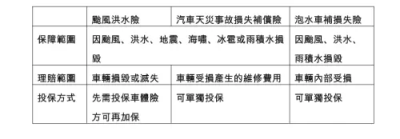 至於愛車泡水或被店家招牌砸傷,要注意投保方式,還有能否向店家求償,尤其愛車泡水或是停在路邊被路樹、招牌砸傷,是颱風天最常見的情景。如果是泡水一般車體險不理賠,僅有「颱風洪水險」、「汽車天災事故損失補償險」及「泡水車補償險」會理賠,其中颱風洪水險必須先投保車體險才能投保,汽車天災事故損失補償險及泡水車補償險則可單獨投保。